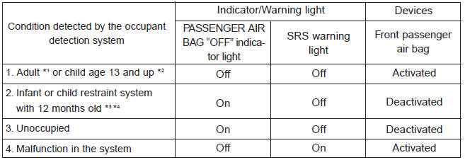 *4) The PASSENGER AIR BAG "OFF" indicator may turn on or off when a child above 12 months to 12 years old (with or without child restraint system) sits in the front passenger seat. This is a normal condition.
