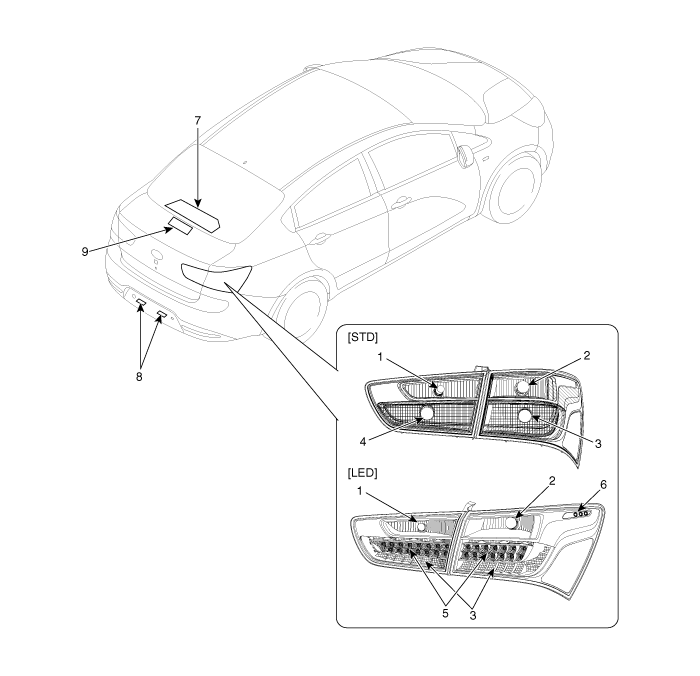 [5 Door] 1. Back up lamp 2. Turn signal lamp 3. Tail lamp/ Stop lamp 4. Tail lamp 5. Stop lamp 6. Side marker lamp 7. High mounted stop lamp 8. Lic ...