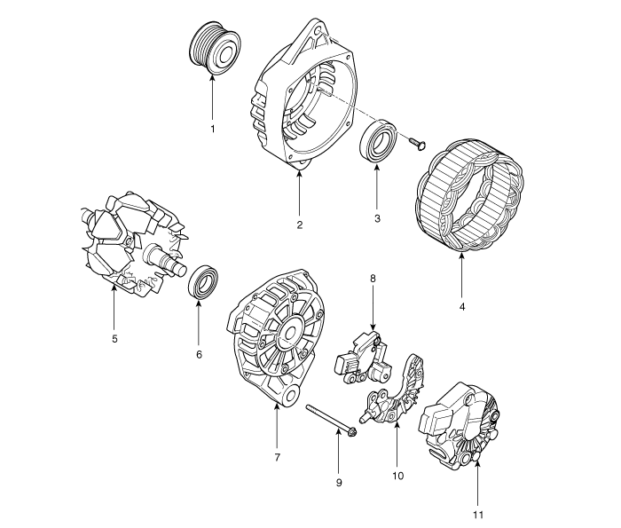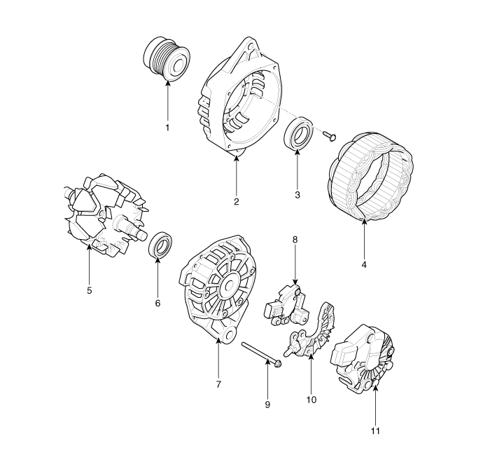 7. Rear Bracket 8. Brush Holder Assembly 9. Through Bolt 10. Rectifier Assembly 11. Rear Cover |