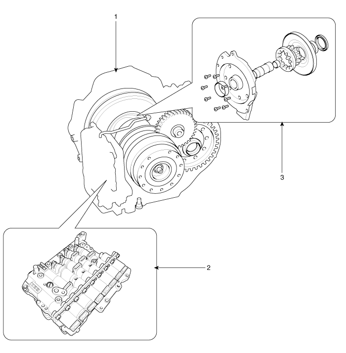 | 1. Automatic transaxle 2. Valve body assembly 3. Oil pump assembly |