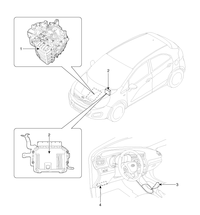| 1. Automatic transaxle 2. Transaxle control module (TCM) |