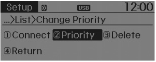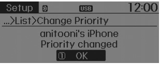 From the paired phone list, select the phone you want to switch to the highest priority, then select [Change Priority] button from the Menu. The selected device will be changed to the highest priority.