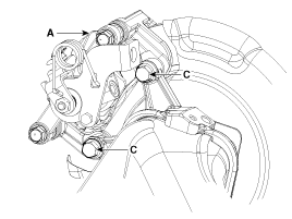 Loosen the caliper mounting bolts (C), then remove the rear caliper