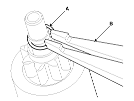 After removing the stop ring (A) using stopper pliers (B).